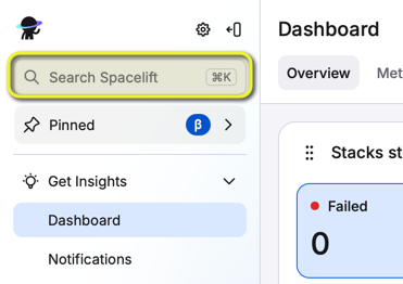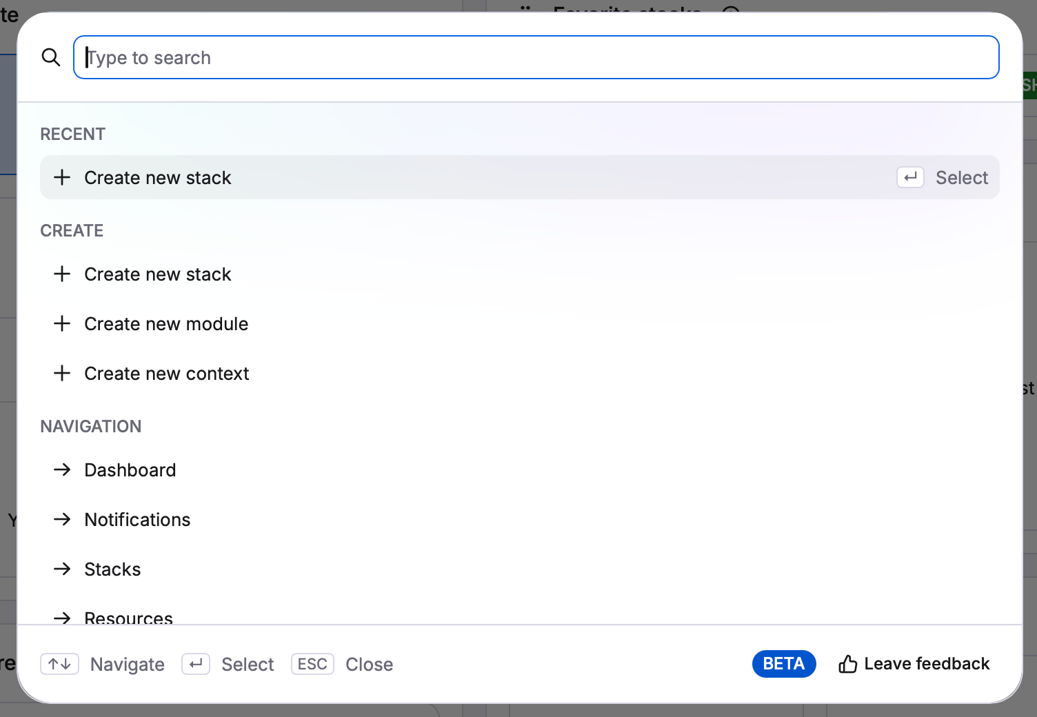 From shortcuts like Create New Stack, and Create New Module, to navigation shortcuts like Dashboard, and Resources. You can also toggle the Theme of the UI, and search for things that may be harder to look for. This feature will be handy for new and experienced Spacelift users alike. You can open this box, and navigate, all with your keyboard. Or use the mouse and click around like you normally do.