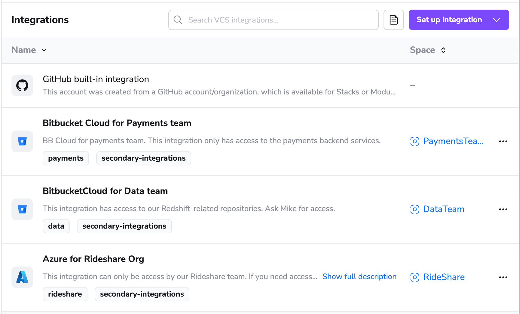 - Fine-grained access control. Have any repositories that should only be available to certain people or teams? Use Space-level integrations! When a VCS integration is tied to a Space, the stack Space needs to have access to the integration Space, similarly to any other Space-level entity such as Policies, Contexts, Cloud Integrations.