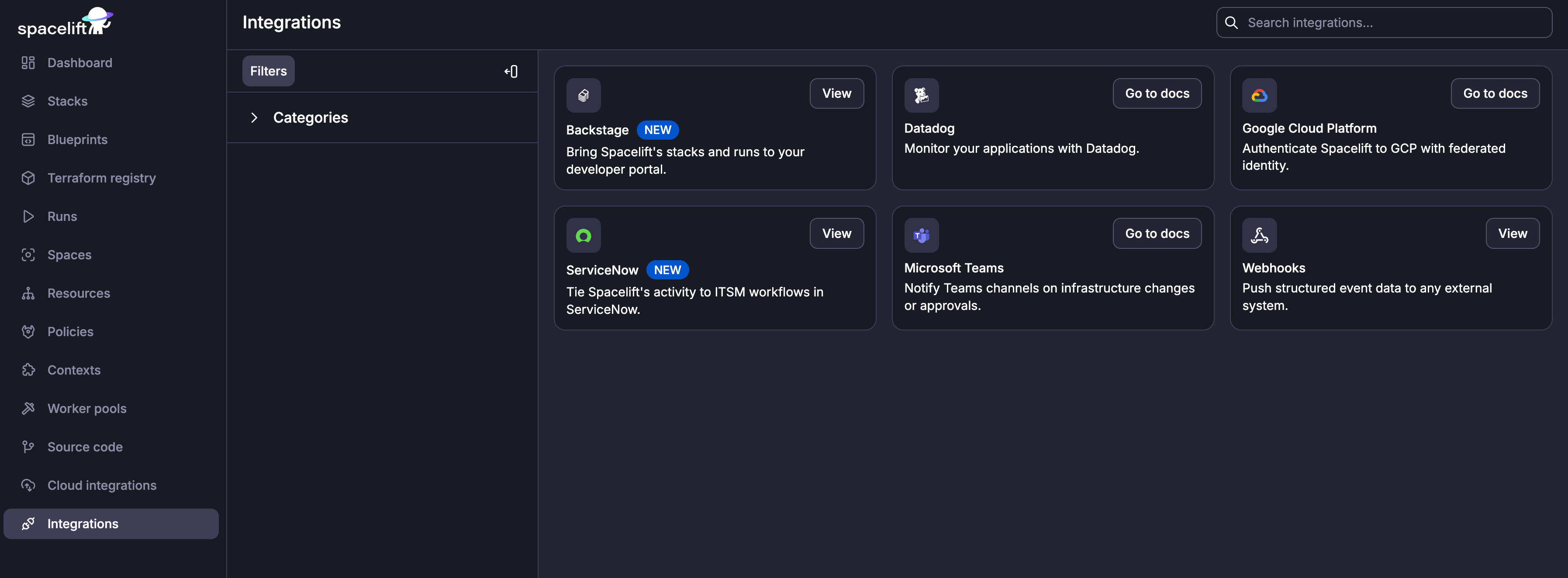 We’ve introduced a new Integrations page in Spacelift to consolidate and simplify the way you manage integrations with third-party tools. This makes the interface cleaner and gives you a unified view of all the available integrations that work out of the box.You can still integrate with any tool you want by using lifecycle hooks, webhooks, API keys, the notification policy, and the ability to bring your own images.